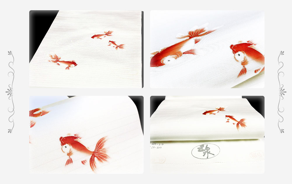 夏物 名古屋帯 十日町友禅 塩瀬 秀美 絽 白地 オフホワイト 金魚 九寸 反物 正絹 本加工友禅 九寸 新品 未仕立て 上品 お洒落着 反物 十日町友禅 秀美 ちりめん 正絹 新品 五泉 塩瀬 お洒落着 カジュアル かわいい おしゃれ かっこいい 粋 モダン 受注生産 No.88-1301